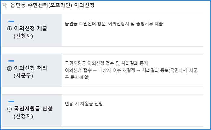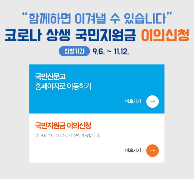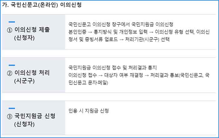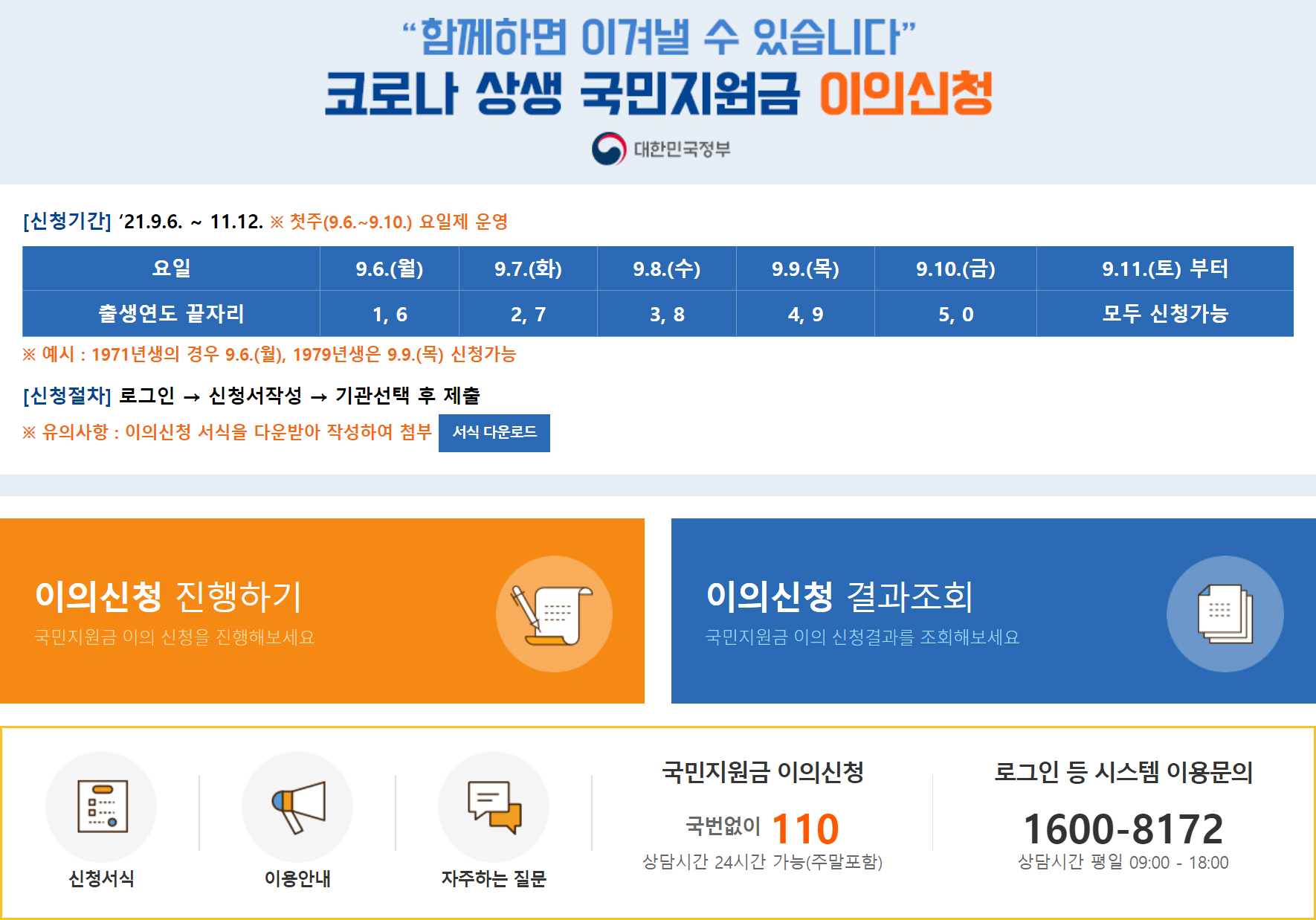 작년과 달리 올해는 온라인으로도 이의 신청이 가능하며 국민지원금 신청이 개시되는 9월 6일 월부터 온라인 국민신문고 또는 주소지를 관할하는 읍면동 주민센터에서 접수를 받습니다.